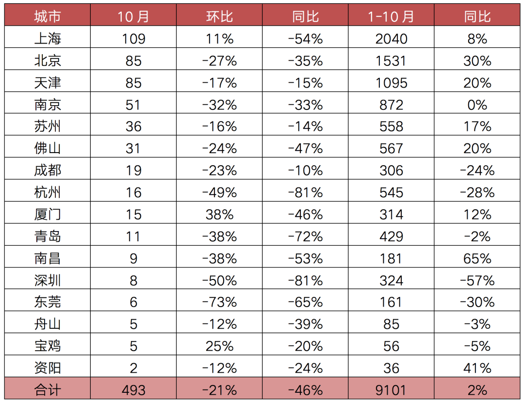 1-10月,16城累計成交9101萬平方米,同比漲幅進一步收窄至2%。其中,4成以上城市累計成交同比轉跌,深圳更以57%的累計同比跌幅居首。