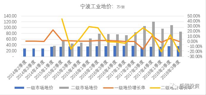 寧波近幾年的一級工業用地出讓面積基本上處于浙江前二的水平,大量供應,使得出讓價僅年增長7.66%。自2015年2季度開始,司法拍賣成交價顯著增長,并一直持續到2017年4季度,年均增長44.28%,截止2017年底,一級出讓價為二級成交價的36%左右。