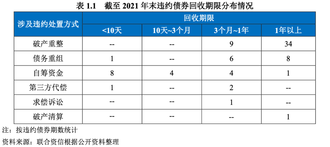 2021年共有34家發行人采用破產重整方式進行違約處置,較上年(21家)大幅增加。從破產重整處置效率來看,自發行人違約至法院裁定重整、裁定重整至裁定批準重整計劃、批準重整計劃至重整計劃執行完畢平均耗時分別為318天、256天和69天,均較2020年有所縮短,破產重整處置效率有所提升;合并重整和預重整案例進一步增加;重整方式更加靈活多樣,出現程序協同重整與實質合并重整方式相結合的重整方式;清償方案不斷豐富,多種處置方案靈活搭配,首次出現兜底回購退出機制的風險處置方案和破產清算轉重整案例。