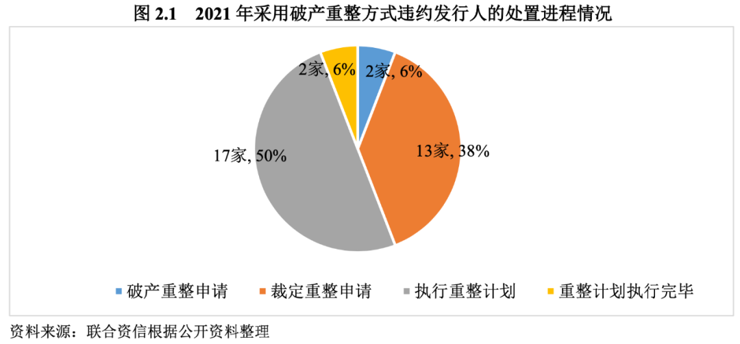 2021年共有34家發行人采用破產重整方式進行違約處置,較上年(21家)大幅增長。從破產重整處置進程來看,截至2021年末,有2家發行人擬進行破產重整,已向法院提交破產重整申請,13家發行人被法院裁定破產重整,17家發行人正在執行重整計劃,2家發行人重整計劃執行完畢并被法院裁定終結破產程序。