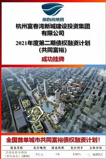 根據(jù)發(fā)行海報(bào),杭州富春灣新城建設(shè)投資集團(tuán)有限公司(以下簡(jiǎn)稱“富春灣建投”)于2021年12月10日成功發(fā)行了2021年度第二期債權(quán)融資計(jì)劃(共同富裕)。本期債權(quán)融資計(jì)劃發(fā)行規(guī)模為5億元,發(fā)行期限為5年,為全國(guó)首單城市共同富裕債權(quán)融資計(jì)劃。