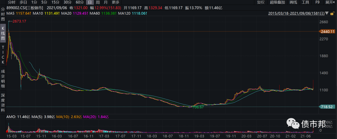 三板做市指數在2015年4月7號,提前創業板近兩個見頂,達到2673點,之后一路下跌,今天大漲后指數也還沒收復高點的一半,押注新三板賽道的投資人損失慘重。