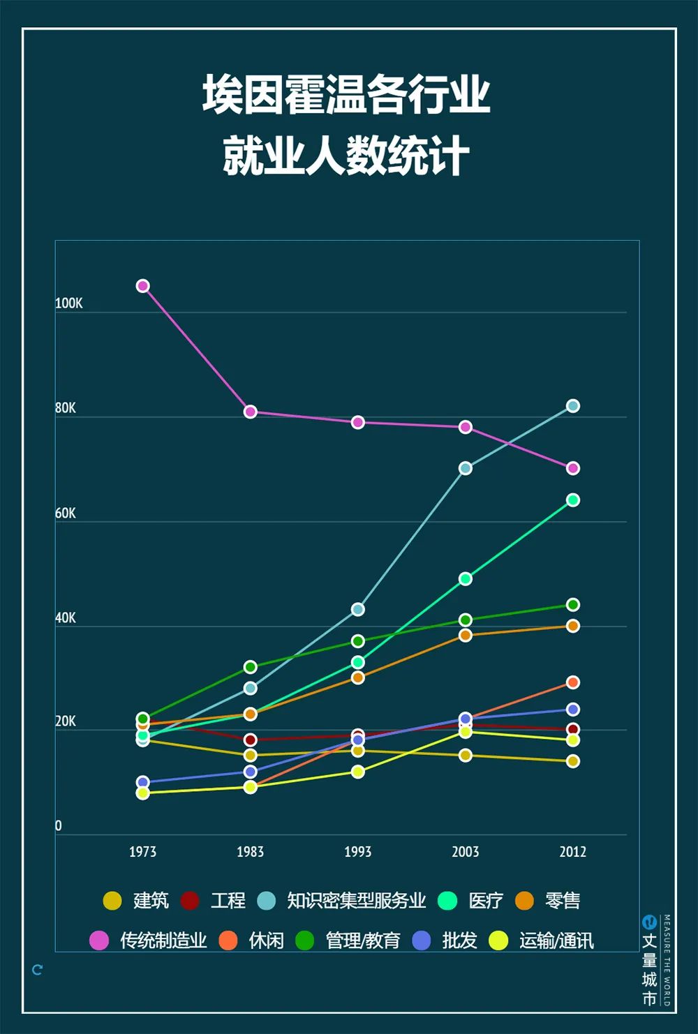 不過,40多年前的埃因霍溫卻是另一番景象——制造業大衰退,大量企業倒閉,短短6個月內3.5萬人失業,此后10年內城市人一直處于負增長狀態。