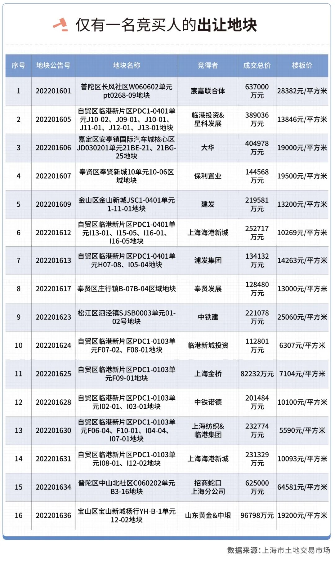 從首日的拍地結果來看,共有16幅地塊,以底價成交。這16幅地塊都僅有一名競買人,競買人直接為地塊竟得者。