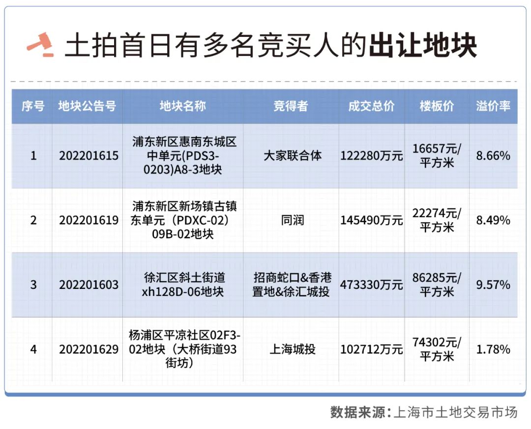 從結果來看,上海土拍恢復首日,整體開局相對較好,盡管經歷了疫情和土拍延期,但并未對房企的參拍熱情造成很大影響。
