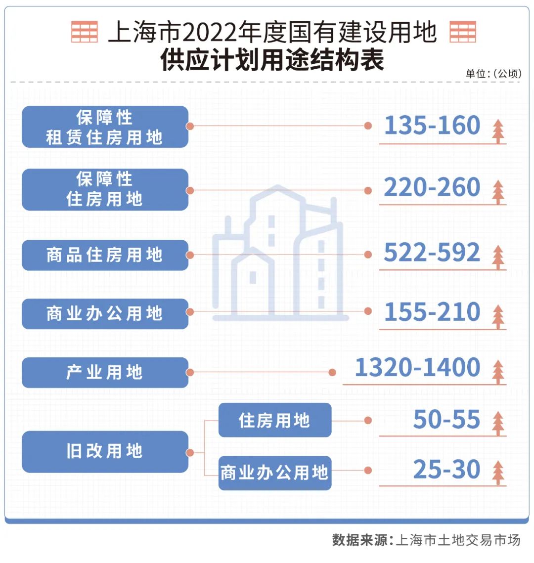 2022年4月26日,上海市規劃和自然資源局正式發布了《上海市2022年度國有建設用地供應計劃》。供應總量有所增長,結構亦發生明顯變化。按計劃,2022年度全市將供應商品住房用地522-592公頃,與2021年相比,2022年土地供應中商品住宅用地、產業用地、舊改用地出現增長,保障住房用地下降。
