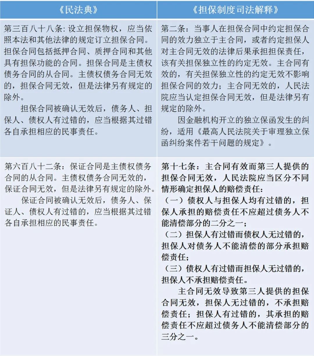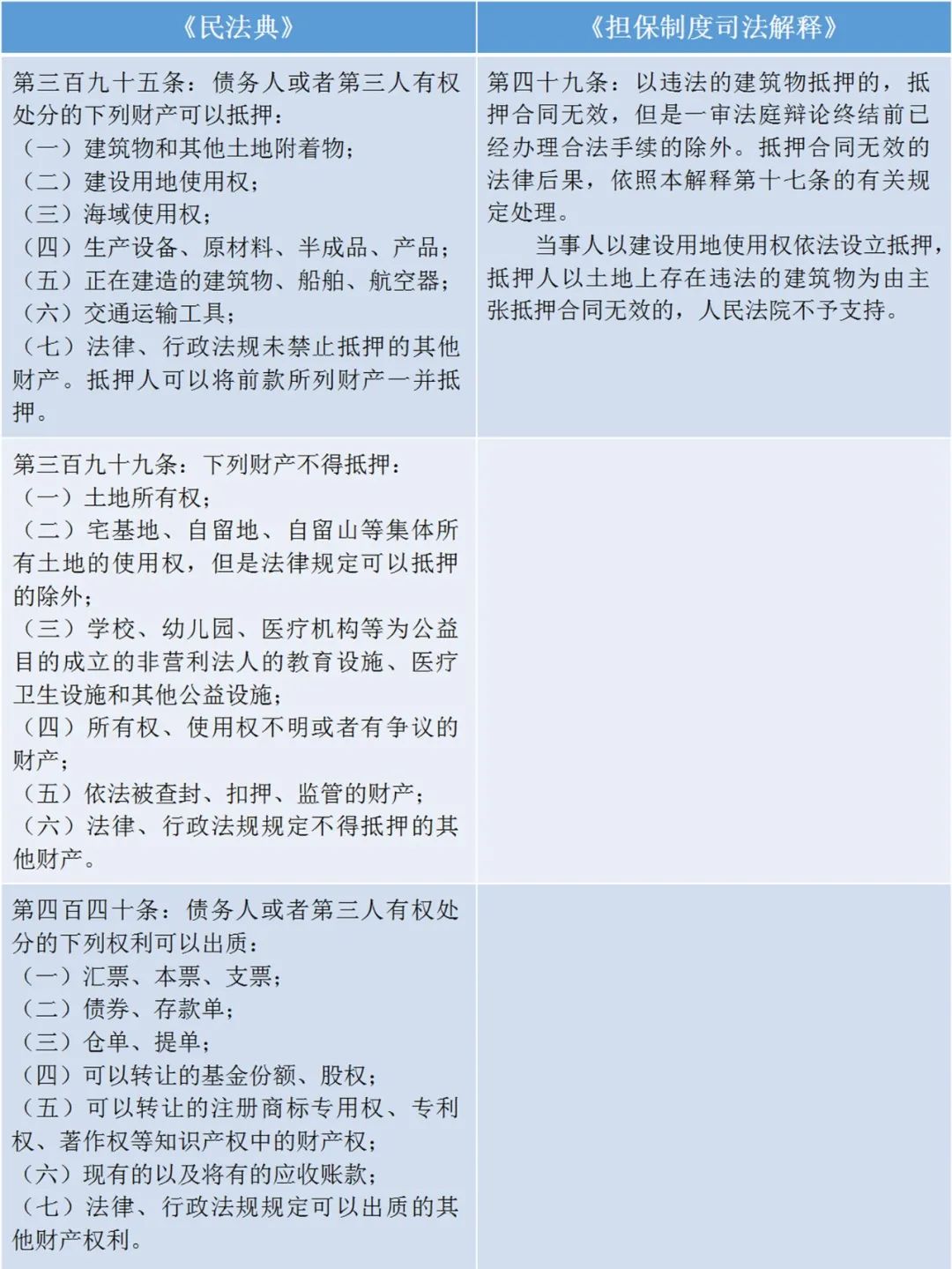 (4)從擔保物的合法性方面認識,《民法典》以列舉的方式,規定了可以抵押和出質的財產種類,以及不得抵押的財產種類,同時也都規定了兜底性條款。若違反法律規定以不得設定擔保的對象進行抵押的,抵押合同無效,此情形下的擔保責任依據《擔保制度司法解釋》第十七條進行分配,擔保人無過錯的,擔保人不承擔賠償責任。其中關于以違法建筑物設定抵押的,依據促進合同履行的原則,只要在一審法庭辯論終結前已經辦理合法手續的,該抵押合同有效。法條鏈接: