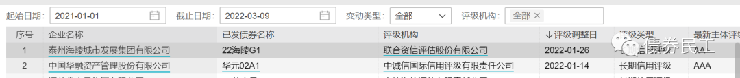 根據(jù)wind資訊的統(tǒng)計(jì)數(shù)據(jù),2022年1月1日至3月9日,國(guó)內(nèi)信用債券市場(chǎng)上債券發(fā)行人評(píng)級(jí)正面變動(dòng)的只有兩例。其中,華融資產(chǎn)為評(píng)級(jí)負(fù)面調(diào)整為正面,主體信用等級(jí)調(diào)升的只有泰州海陵城市發(fā)展集團(tuán)有限公司,主體信用等級(jí)由AA調(diào)升至AA+。