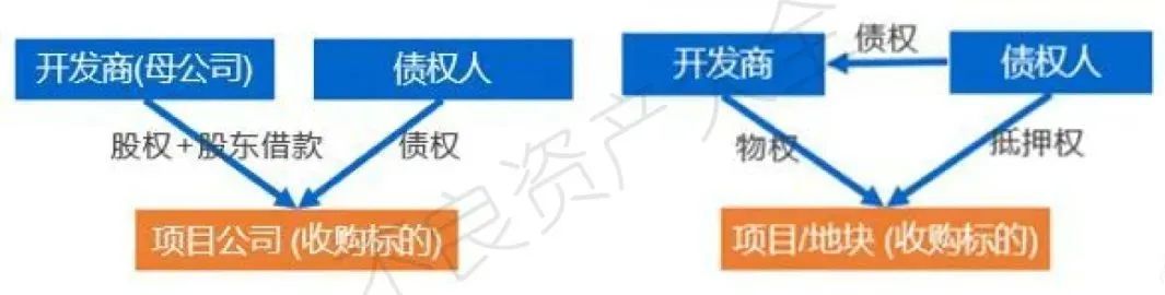 如上左圖,投資人愿意收購項目公司股權的同時收購項目公司的債權(股東借款)。或者如右圖,投資人收購標的地塊同時,幫助債務人(開發商)清償債務以解除標的地塊的權利障礙(抵押權等)。在將項目公司或標的地塊收購并清除權利障礙后,或開發后銷售回款,或直接出售給其他開發商。