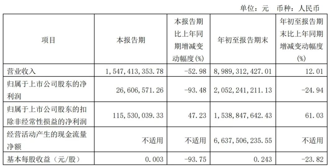 2021年第三季度,新湖中寶的營收為15.47億元,同比下滑52.98%,歸屬于上市公司股東的凈利潤下降更厲害,達(dá)到93.48%,為2660.7萬元,扣非后的凈利潤稍微好一些,上升了47.23%,為1.16億元。