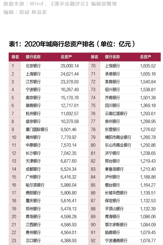 來自wind的數(shù)據顯示,截止到2020年12月31日,城商行總資產排名第一的是北京銀行,其資產總規(guī)模為29,000億元;依次往后為上海銀行,總資產為24,621億元;江蘇銀行,資產總規(guī)模為23,378億;寧波銀行排第四,資產總規(guī)模為16,267億元;南京銀行為15,170億元,杭州銀行為11,692億元。