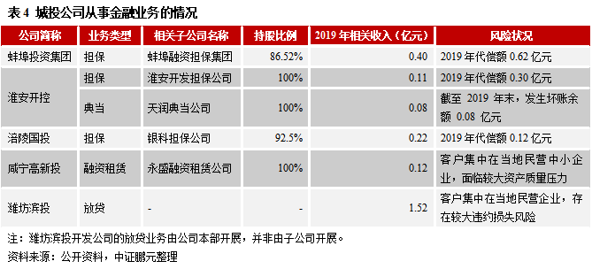 (4)風(fēng)險提示:弱資質(zhì)城投公司的業(yè)務(wù)經(jīng)驗主要集中在基礎(chǔ)設(shè)施投融資領(lǐng)域和公用事業(yè)領(lǐng)域,其“原生”管理團(tuán)隊不具備足夠的專業(yè)質(zhì)素,以應(yīng)對金融業(yè)務(wù)的經(jīng)營運作和風(fēng)險把控,存在較大的因決策失誤導(dǎo)致投資失敗的可能性。而且,即便是重金聘請職業(yè)經(jīng)理人來管理金融業(yè)務(wù),也大概率存在水土不服的情況,較難在城投體制下發(fā)揮其專業(yè)才干。另外,城投公司開展金融業(yè)務(wù)很多時候是響應(yīng)政府號召,履行國企社會責(zé)任,比如為當(dāng)?shù)氐拿駹I企業(yè)、小微企業(yè)等提供擔(dān)保、小貸等,但此類服務(wù)對象的抗風(fēng)險能力普遍較弱,政策環(huán)境、市場環(huán)境一旦出現(xiàn)不利變化,很容易就出現(xiàn)經(jīng)營虧損、資金斷裂、無力償債等情況(見表4),導(dǎo)致城投公司不得不代為償還,進(jìn)而損害自身的資金流和經(jīng)營效益。