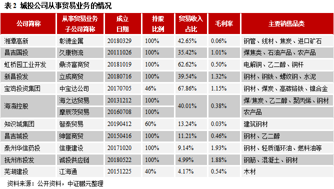 (4)風(fēng)險提示:貿(mào)易業(yè)務(wù)通常會對弱資質(zhì)城投公司造成大規(guī)模的資金占用,而且利潤極薄,毛利率多在2%以內(nèi)(見表2)。在風(fēng)控制度和相關(guān)措施不完善的情況下,或者是遭遇周期性經(jīng)濟(jì)下行,貿(mào)易業(yè)務(wù)很可能出現(xiàn)虧損,而且由貿(mào)易業(yè)務(wù)形成的應(yīng)收賬款還將面臨很大的壞賬風(fēng)險。
