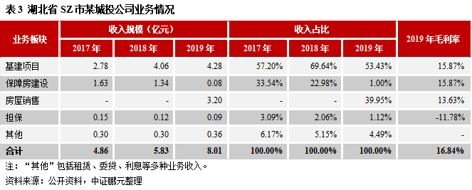 (4)風(fēng)險提示:隨著地方政府隱性債務(wù)風(fēng)險越來越受到中央重視,城投公司的處境也越來越難,“信仰”的光環(huán)越來越趨于淡化。為了謀生存,城投公司一方面必須盡全力保持自身在公益/準(zhǔn)公益領(lǐng)域的區(qū)域?qū)I性,以強(qiáng)化城投屬性并爭取獲得更高概率、更大力度的政府支持;另一方面城投公司還不得不做一些市場化業(yè)務(wù)的拓展和培育,以強(qiáng)化自身作為一個企業(yè)實體的造血能力、盈利能力。這種背景下,不管是否具備充分的條件,城投公司都或多或少地會去涉足一些市場化業(yè)務(wù),而經(jīng)驗的不足、團(tuán)隊的不專業(yè)、市場開拓的阻力等都會加大業(yè)務(wù)運營風(fēng)險,導(dǎo)致的后果就是:涉足了很多類型的市場化業(yè)務(wù),確實產(chǎn)生了一定規(guī)模的收入,但卻沒有真正形成新的主營業(yè)務(wù)板塊,單個板塊的收入規(guī)模占比很低,且毛利率存在異常(多數(shù)時候是負(fù)數(shù),有時候也可能高得離譜),因此在進(jìn)行各業(yè)務(wù)板塊收入成本情況的統(tǒng)計分析時只好將眾多“不成氣候”的市場化業(yè)務(wù)歸于“其他”一類,表面上看收入規(guī)模不小,但其在擴(kuò)充公司總體營業(yè)收入規(guī)模的同時,背后也可能潛藏了相當(dāng)多的風(fēng)險。舉個例子,一家城投公司將酒店運營作為市場化業(yè)務(wù)的其中一個發(fā)力點,但酒店業(yè)的初始投資規(guī)模很大,后續(xù)還會產(chǎn)生較大的翻修成本,同時酒店業(yè)的投資回報期是比較長的,而且也很難一直保持旺季時的高入住率,所以短期內(nèi)考慮攤銷折舊之后酒店運營板塊極可能是虧損的。那么,對于該城投公司來說,酒店運營板塊除了對總體營業(yè)收入有一定貢獻(xiàn)外,實際上則增加了其資金壓力,弱化了其盈利能力,對強(qiáng)化償債保障反而產(chǎn)生了掣肘。