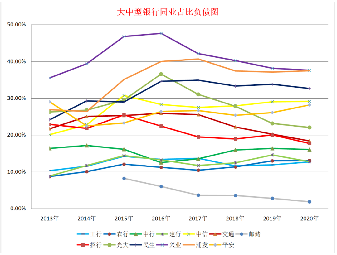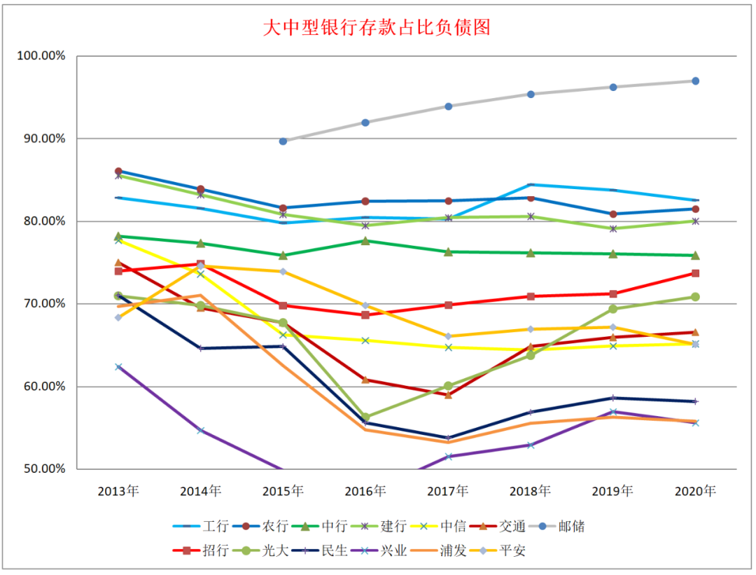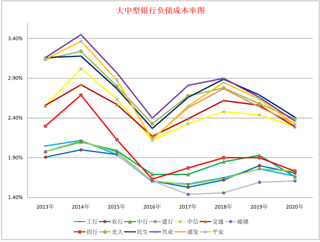 1、總體規律。四大行和郵儲銀行憑借全覆蓋的網點,存款與負債的比值明顯高于其他銀行,負債占比要比其他銀行小得多,其總的存款成本和負債成本相對來說都很低。招商銀行最大的特點是活期存款占比遙遙領先,說明了超強的客戶粘性,這確實是一條護城河。從數據上看,各銀行在負債成本上步調基本一致,銀行的成本受經濟發展和宏觀調控的影響,存款成本2013-2014年上升,2015-2017年下降,2018-2019年上升,2020年下降,預計2021年會保持穩定并略有下降。在負債成本方面,國有大行和招商銀行受政策影響要小一些,股份制銀行受政策影響要大得多。