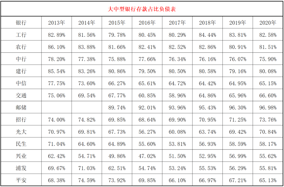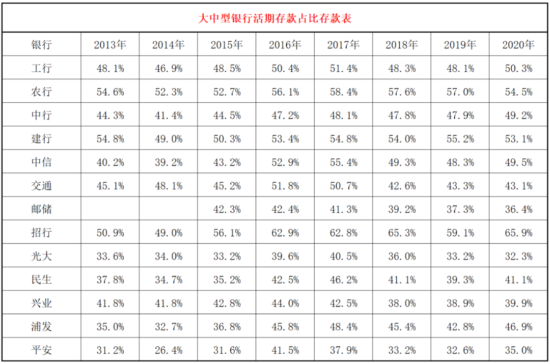 為此,我們繼續統計了13家大中型銀行過去八年存款與負債的比值,同業負債與負債的比值,活期存款與存款的比值,存款的總成本率,負債的總成本率五個指標,從這些角度看各家銀行的負債結構和成本。