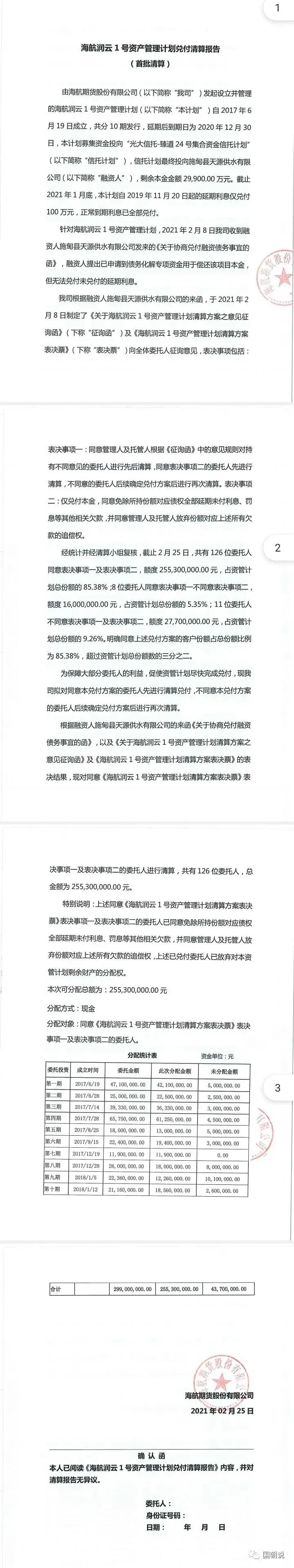 2月25日,海航期貨發布了《海航潤云1號資產管理計劃兌付清算報告(首次清算)》,向我們披露了關于該項目的最新動態。