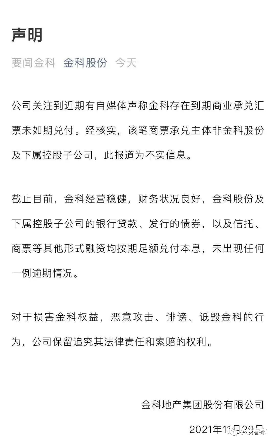 11月29日,金科股份(000656.SZ)聲明稱,近期有自媒體聲稱其存在到期商業(yè)承兌匯票未如期兌付。經(jīng)核實(shí),該筆商票承兌主體非金科股份及下屬控股子公司,此報(bào)道為不實(shí)信息。