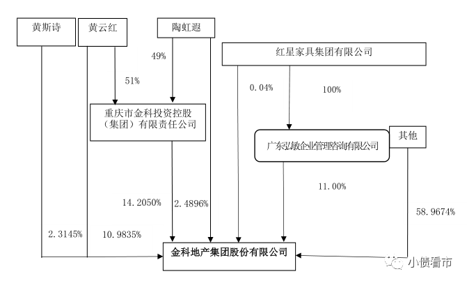 從股權(quán)結(jié)構(gòu)看,創(chuàng)始人黃紅云及其一致行動(dòng)人陶虹遐和黃斯詩間接和直接合計(jì)持有金科股份29.9926%的股權(quán),黃紅云為公司實(shí)際控制人。