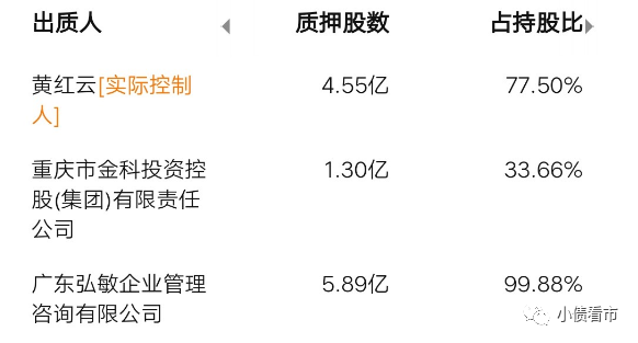 從股權(quán)質(zhì)押上看,截至今年6月末,金科投資、黃紅云及其一致行動(dòng)人共計(jì)質(zhì)押金科股份4.48億股股票,占其所持股份的27.97%;廣東弘敏股權(quán)質(zhì)押率為99.88%。