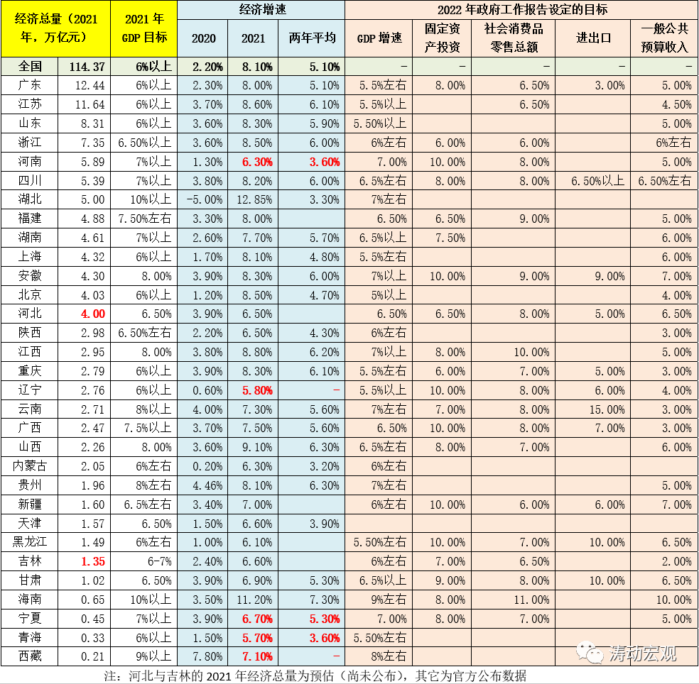 絕大部分地區將2022年的經濟增速目標設定在5.50-7%的區間內,且廣東、江蘇與山東等三巨頭均將5.50%的經濟增速視為2022年的底線要求,同時考慮到2021年上述三巨頭的經濟增速目標(6%以上)均與全國平均水平一致,因此我們有理由相信5.50%亦是2022年全國經濟增速的底線要求,也即2022年全國的經濟增速目標大概率為5.50%左右。