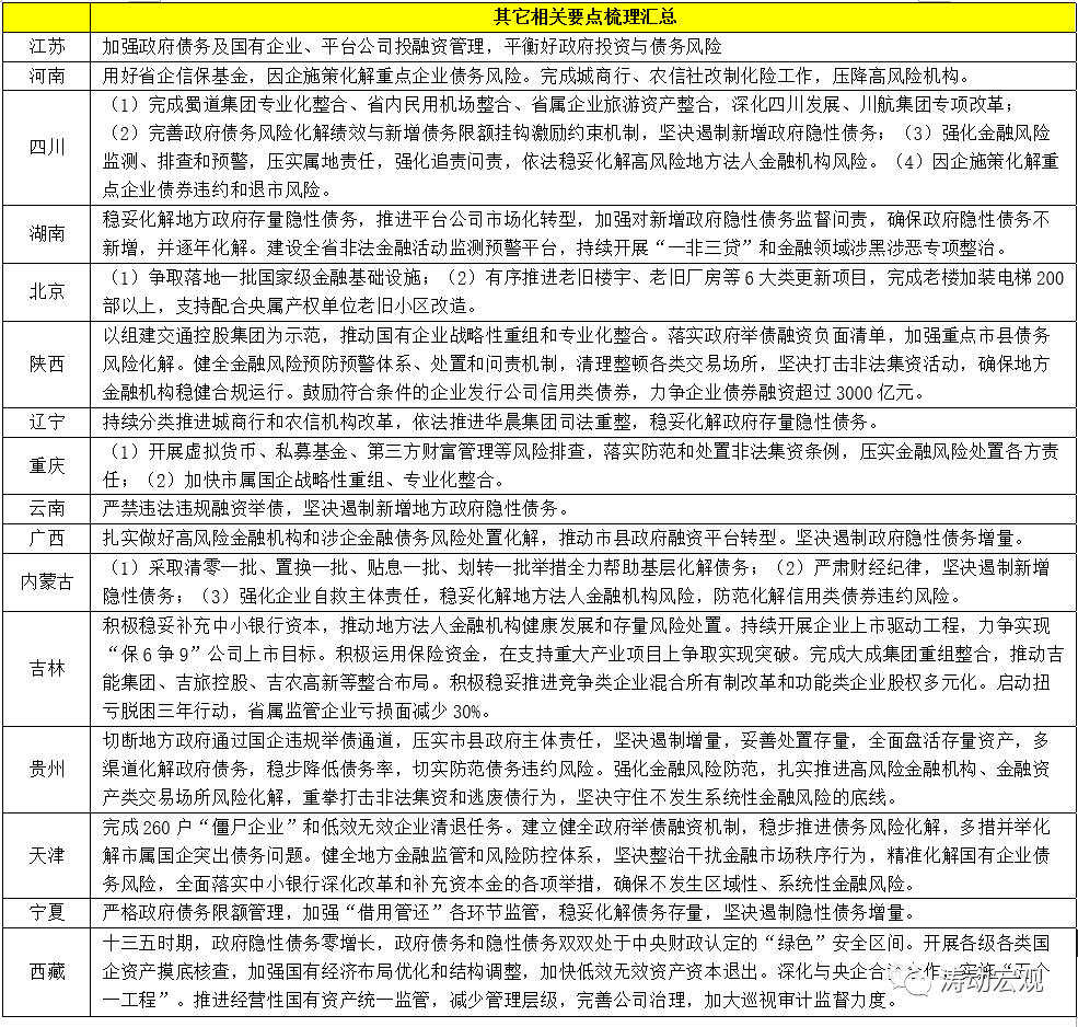 (十一)貴州提出要切斷地方政府通過國企違規舉債通道,壓實市縣政府主體責任,堅決遏制增量,妥善處置存量,全面盤活存量資產,多渠道化解政府債務,穩步降低債務率,切實防范債務違約風險。同時要強化金融風險防范,扎實推進高風險金融機構、金融資產類交易場所風險化解,重拳打擊非法集資和逃廢債行為,堅決守住不發生系統性金融風險的底線。