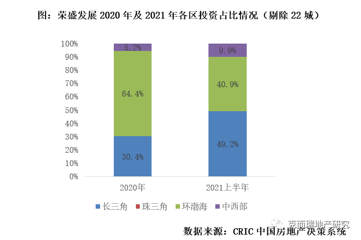 榮盛、金科調(diào)整區(qū)域布局,避開(kāi)長(zhǎng)三角、珠三角熱門城市,尋求三四線城市投資契機(jī)。榮盛起家于河北,金科起家于重慶,從二者近年來(lái)的布局來(lái)看,企業(yè)正積極調(diào)整投資布局,弱化大本營(yíng)投資,向長(zhǎng)三角、珠三角等熱點(diǎn)區(qū)域進(jìn)軍。然而由于土地市場(chǎng)持續(xù)高熱,競(jìng)爭(zhēng)壓力較大,作為新晉房企,榮盛和金科選擇避開(kāi)熱點(diǎn)的22城,尋求其他三四線城市布局契機(jī)。根據(jù)CRIC監(jiān)測(cè),2021年上半年榮盛發(fā)展非22城拿地金額占比達(dá)61.3%,明顯高于TOP50房企平均水平的36.6%。