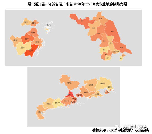 區(qū)域高度重疊,房企紛紛涌向長(zhǎng)三角、珠三角,浙江、江蘇、廣東三省的非22城是TOP50房企投資三甲,三者占TOP50房企非22城投資總額的63.7%。以房企非22城拿地金額口徑來(lái)看,現(xiàn)階段房企投資區(qū)域十分聚焦,以東南沿海為主,主要是長(zhǎng)三角和珠三角兩大板塊。其中長(zhǎng)三角的浙江和江蘇是房企最為熱衷的省份,TOP50拿地投資金額超過(guò)千億,珠三角的廣東則緊隨其后。