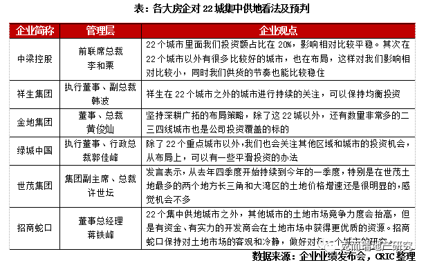 中梁、祥生、金地、綠城表示要尋求22城之外投資機(jī)會(huì),招商蛇口、世茂直言部分熱點(diǎn)區(qū)域土地價(jià)格被抬高。在房企的年終業(yè)績(jī)發(fā)布會(huì)上,“雙集中”供地后的土地投資策略是被提及最多的問(wèn)題之一,謹(jǐn)慎、中性、保持節(jié)奏是多數(shù)房企的回答。其中中梁、祥生、金地、綠城等房企提出除了關(guān)注22城集中供地之外,還要尋求其他城市的投資機(jī)會(huì)來(lái)平衡投資。而世茂管理層則直言長(zhǎng)三角和大灣區(qū)土地價(jià)格增速明顯,感覺(jué)機(jī)會(huì)不多。招商蛇口也表示其他城市土地競(jìng)爭(zhēng)力抬高,要保持客觀冷靜的投資態(tài)勢(shì)。