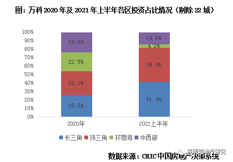 基于長(zhǎng)三角、珠三角的發(fā)展前景,萬(wàn)科下沉兩地非22城尋求投資契機(jī)。根據(jù)CRIC監(jiān)測(cè),在保持了一定投資力度的前提之下,上半年萬(wàn)科投資力度向非22城傾斜,占比相比2020年上升了9.3個(gè)百分點(diǎn)達(dá)到了62.0%,上半年并未在一線城市納儲(chǔ)。并且萬(wàn)科則出現(xiàn)了非常典型的區(qū)域集中情況,2021年上半年,萬(wàn)科非22城投資金額中超過(guò)8成投向了長(zhǎng)三角、珠三角兩大區(qū)域,以金華、溫州、中山等熱點(diǎn)城市為主,相比2020年的均衡型投資有明顯調(diào)整。不過(guò)在6月底,萬(wàn)科進(jìn)行了新的組織架構(gòu)變革,由五大區(qū)裂變成七大區(qū),主要是將北方區(qū)域裂變?yōu)楸本|北,中西部裂變成華中、西南區(qū)域,組織先行,未來(lái)企業(yè)仍有望擴(kuò)大兩地拿地份額。
