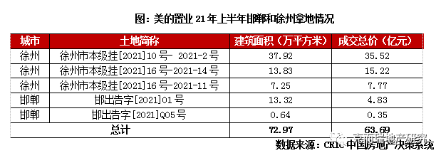 美的置業(yè)持續(xù)鞏固深耕優(yōu)勢(shì)城市,上半年僅在22城斬獲一幅土地。美的置業(yè)同樣采取深耕策略,不過(guò)與中梁、祥生不同的是,美的置業(yè)持續(xù)加碼自身的高市占率城市。企業(yè)2010年走出珠三角,其全國(guó)化布局便是從長(zhǎng)三角的徐州開(kāi)始,之后進(jìn)駐邯鄲,根據(jù)CRIC的統(tǒng)計(jì),2020年美的置業(yè)在兩城的市占率均居首位。2021年上半年,美的置業(yè)持續(xù)擴(kuò)大在徐州和邯鄲的布局,分別拿下3幅、2幅土地,合計(jì)拿地金額達(dá)63.69億元。