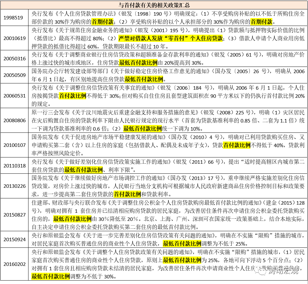 1998年以來,為支持住房金融業務發展,央行發布了一系列政策和規定,并對最低首付比例提出相應要求,隨后根據不同階段的住房金融調整方向對最低首付比例進行調整,大致的比例主要有20%、25%、30%等等。