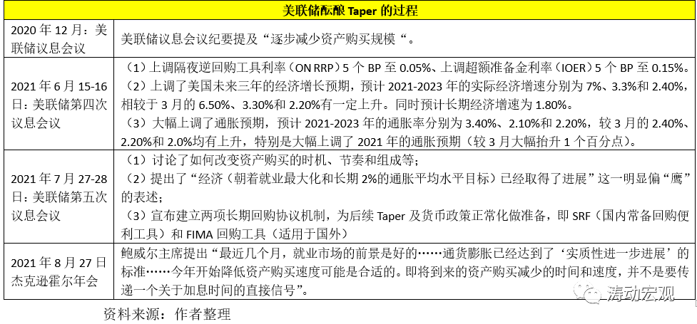 前面已經指出,美聯儲的貨幣政策正常化路徑基本上遵循“向市場釋放Taper信號——Taper過程——向市場釋放加息信號——加息——向市場釋放縮表信號——正式縮表”的邏輯脈絡。