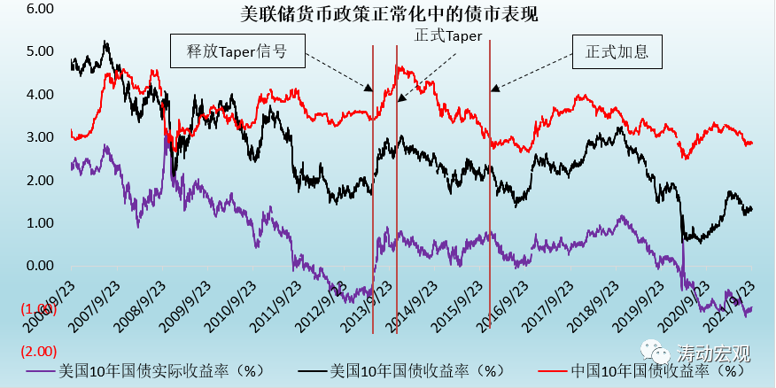4、中國債市同樣在美聯儲向市場釋放Taper信號和加息信號的預期階段,出現了比較明顯的上行。