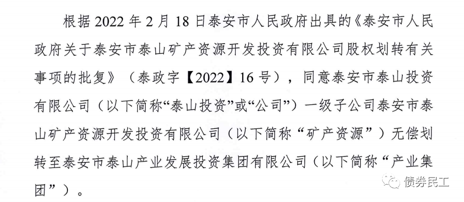 1、根據(jù)泰安市泰山投資有限公司(主體信用等級(jí)AA+)2022年2月21日的公告,將子公司泰安市泰山礦產(chǎn)資源開發(fā)投資有限公司無償劃轉(zhuǎn)至泰安市泰山產(chǎn)業(yè)發(fā)展投資集團(tuán)有限公司。泰安市泰山產(chǎn)業(yè)發(fā)展投資集團(tuán)有限公司未發(fā)行過債券。