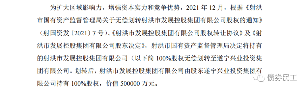5、根據(jù)射洪市國有資產(chǎn)經(jīng)營管理集團(tuán)有限公司(主體信用等級(jí)AA-)2022年1月28日的公告,射洪市國有資產(chǎn)監(jiān)督管理局決定將持有的射洪市發(fā)展控股集團(tuán)有限公司100%股權(quán)無償劃轉(zhuǎn)至遂寧興業(yè)投資集團(tuán)有限公司。遂寧興業(yè)投資集團(tuán)有限公司未發(fā)行過債券。