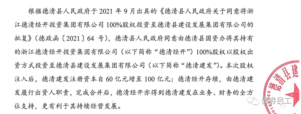 2、根據(jù)德清縣建設(shè)發(fā)展集團(tuán)有限公司(主體信用等級(jí)AA+)2022年2月10日的公告,德清縣國資辦將其持有的浙江德清經(jīng)開投資集團(tuán)有限公司100%股權(quán)以股權(quán)出資方式投資至公司。浙江德清經(jīng)開投資集團(tuán)有限公司主體信用等級(jí)AA,債券存量金額為12.98億元。