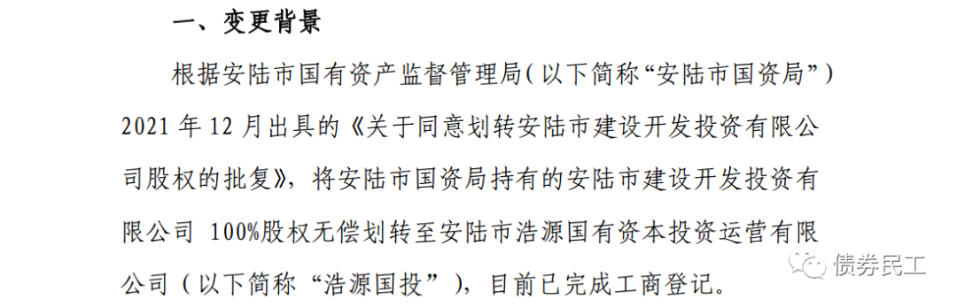 9、根據(jù)安陸市建設(shè)開發(fā)投資有限公司(主體信用等級(jí)AA-)2022年1月13日的公告,將安陸市國資局持有的100%股權(quán)無償劃轉(zhuǎn)至安陸市浩源國有資本投資運(yùn)營有限公司。安陸市浩源國有資本投資運(yùn)營有限公司未發(fā)行過債券。