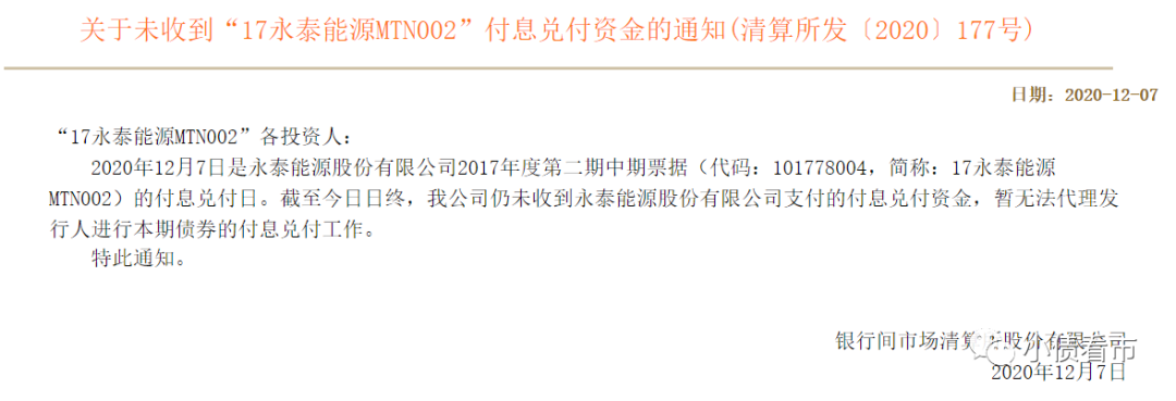 12月7日,上清所公告稱,未收到永泰能源(600157.SH)2017年度第二期中期票據(17永泰能源MTN002)付息兌付資金,暫無法代理發(fā)行人進行本期債券的付息兌付工作。