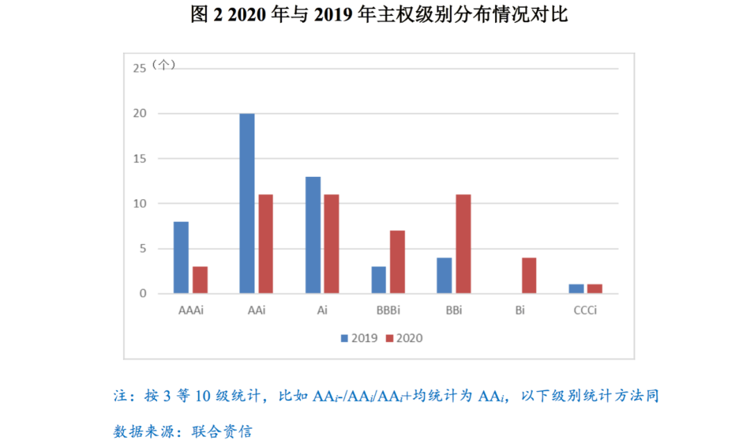 從級別分布看, 2020年受評國家整體級別中樞下移的趨勢較為明顯。由圖2可以看出,在跟蹤國家數(shù)基本持平的前提下,與2019年的級別分布相比,2020年,AAAi級國家減少5個,AAi級減少9個,Ai級國家減少2個;同時,BBBi級增加4個,BBi級增加7個,Bi級增加4個,CCCi級仍為1個。