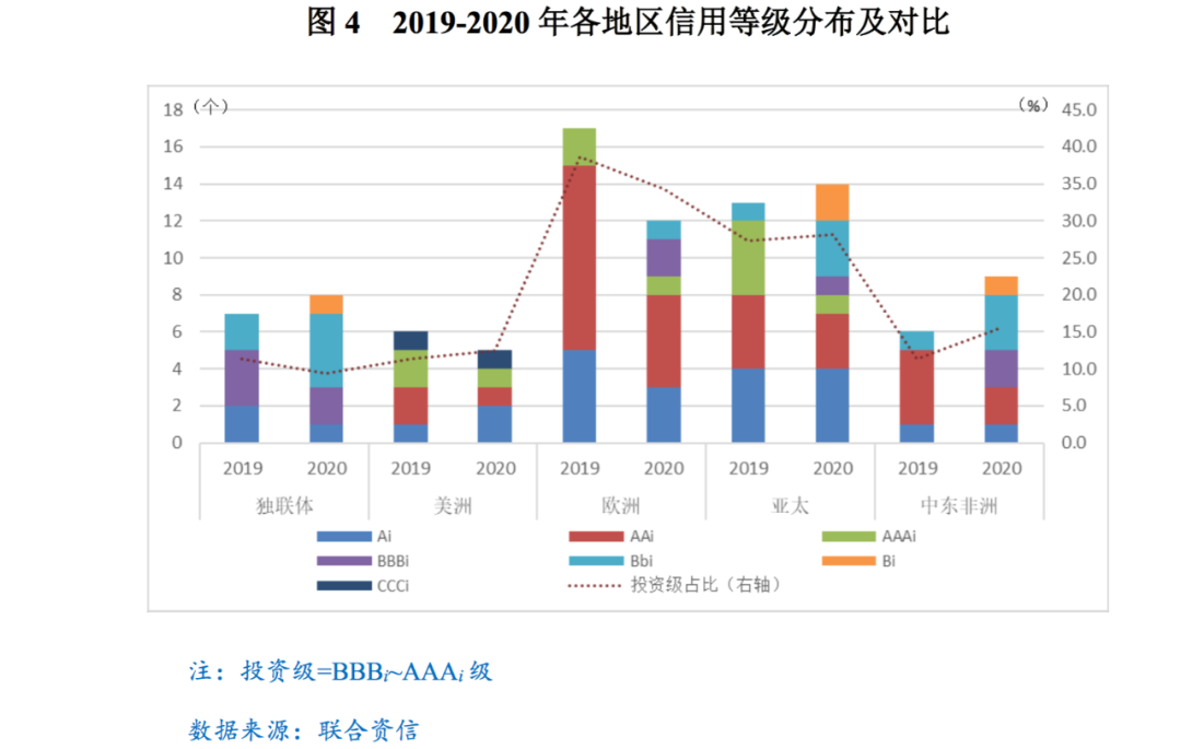 從主權(quán)信用級別的地區(qū)分布維度看,在受評國家集中的美洲、歐洲、亞太、獨聯(lián)體和中東非洲五個區(qū)域當(dāng)中,投資級占比方面,2020年整體投資級別分布區(qū)域與2019年大致保持不變,歐洲地區(qū)投資級國家占比仍然最高(34%),但較上年下降了5個百分點;其次是亞太地區(qū)(28%),同比上升了1個百分點;而獨聯(lián)體地區(qū)的投資級國家占比最低(9%),同比下降了2個百分點。各地區(qū)級別分布狀況變化方面,2020年的各地區(qū)的級別分化程度更為顯著,且均呈現(xiàn)出不同程度的級別中樞下移特征。
