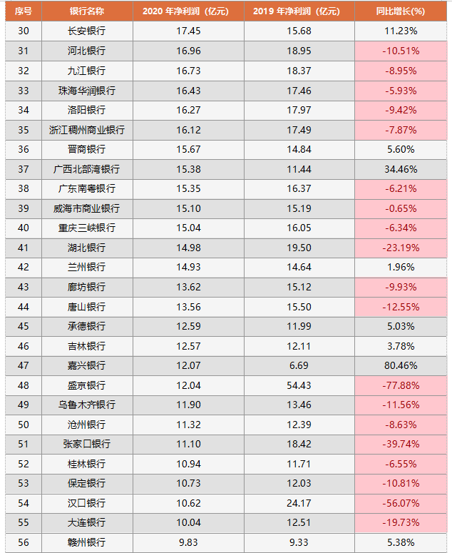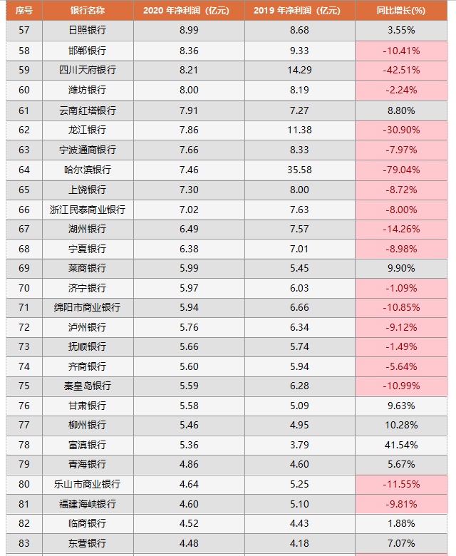 江西銀行、廈門銀行、長安銀行等79家城商行,凈利潤在20億以下。其中,同比增速排名前五的均出自這一梯隊,具體包括:嘉興銀行增速第一,達到80.46%;其次是海南銀行的59.23%;第三是富滇銀行的41.54%;第四是廣西北部灣銀行的34.46%;最后是平頂山銀行的18.35%。此外,有55家城商行負增長,占比過半。盛京銀行、漢口銀行、哈爾濱銀行、溫州銀行、金華銀行、阜新銀行和鄂爾多斯銀行降幅均超過了50%,鄂爾多斯銀行同比下滑了98.16%。