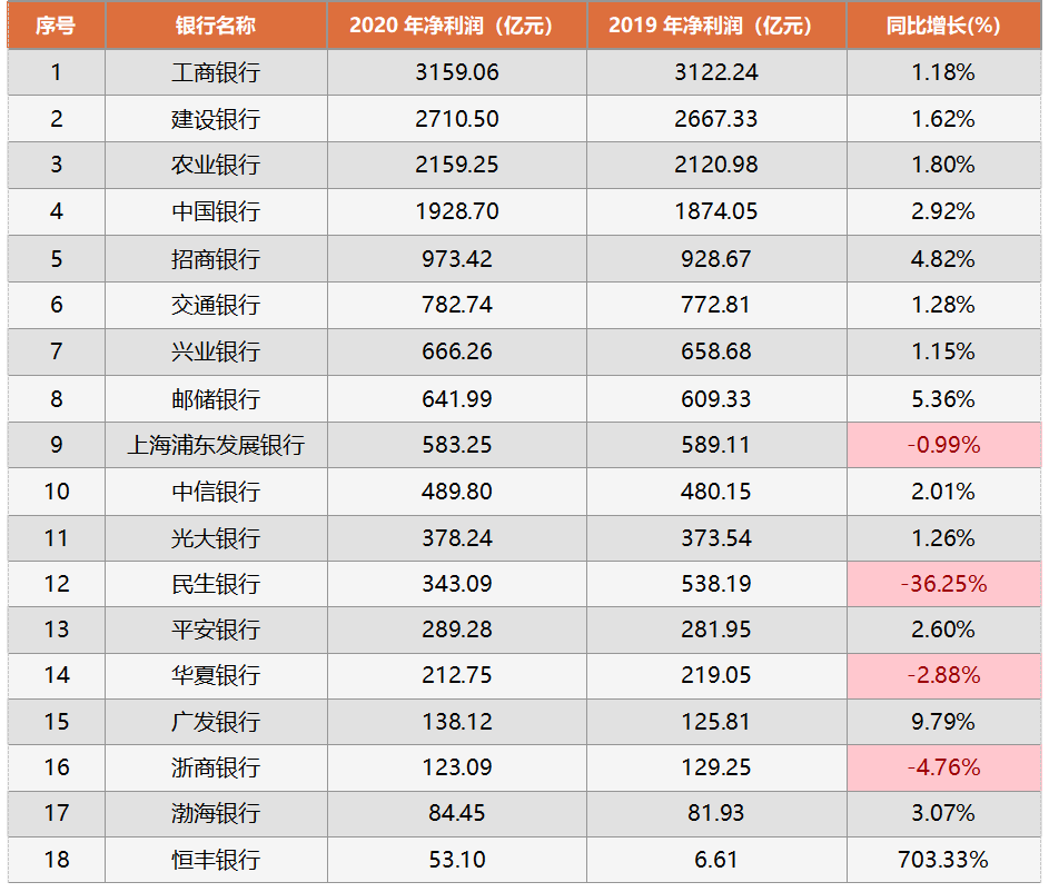 二、18家全國性銀行PK:工行盈利超3000億,恒豐銀行增速最高