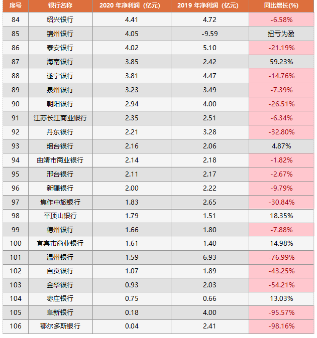 表 3:106家城商行披露的2019-2020年凈利潤變化表