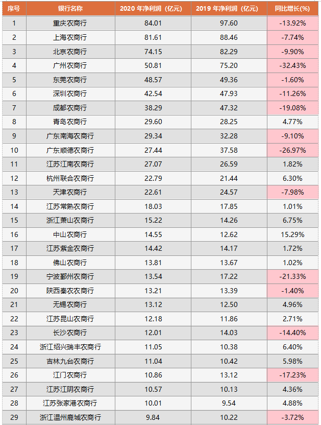 重慶農(nóng)商行排名第一,凈利潤達到84.01億元,同比下降了13.92%;
