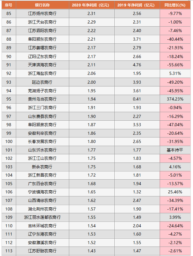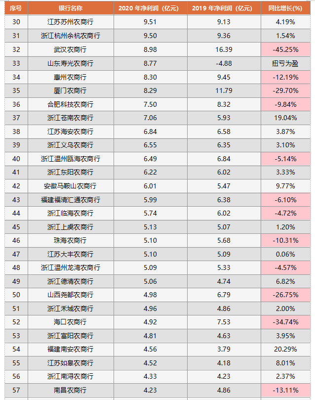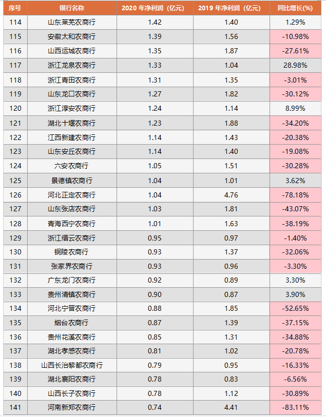 浙江縉云農(nóng)商行、銅陵農(nóng)商行、張家界農(nóng)商行、廣東龍門農(nóng)商行等38家農(nóng)商行,凈利潤處于1億元以下,其中有33家呈現(xiàn)同比負增長,僅有4家銀行同比正增長,分別是廣東龍門農(nóng)商行、貴州清鎮(zhèn)農(nóng)商行、浙江紹興恒信農(nóng)商行、山東榮成農(nóng)商行,吉林蛟河農(nóng)商行2020年虧損收窄,從2019年的-1.56億元到2020年的-1.14億元。