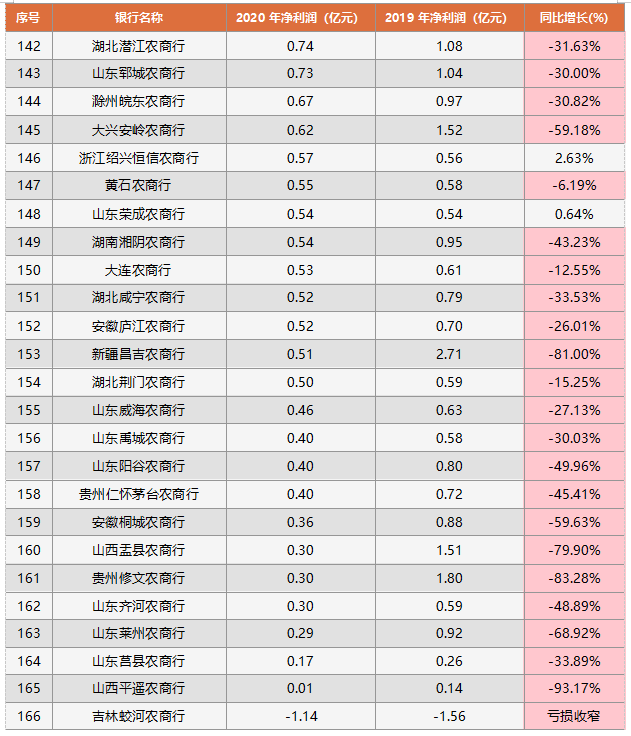 四、166家農(nóng)商行PK:重慶農(nóng)商行盈利第一,106家呈現(xiàn)負增長
