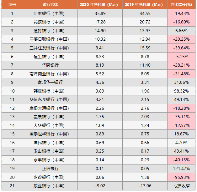表 5:21家外資銀行披露的2019-2020年凈利潤變化表