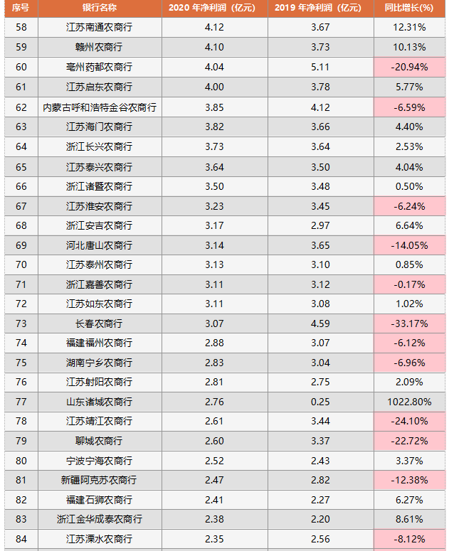 (四)38家農(nóng)商行凈利潤在1億以下,33家負增長