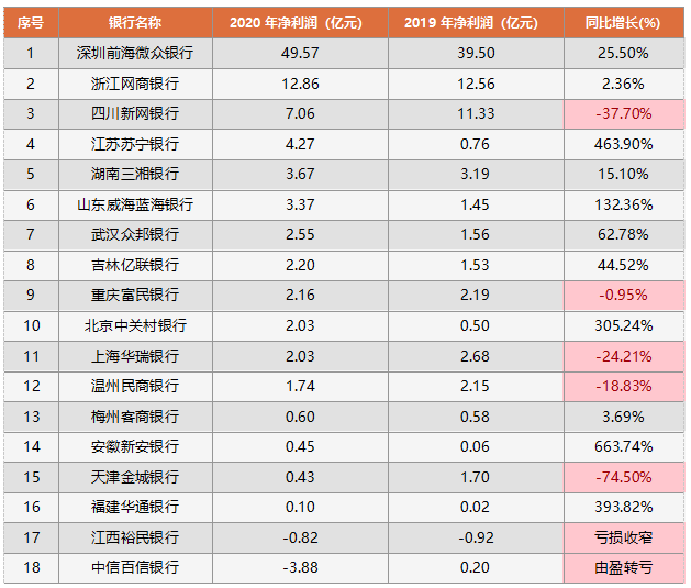 微眾銀行在已披露凈利潤數(shù)據(jù)的民營銀行之中,凈利潤最大,達到49.57億元,同比增長25.50%;